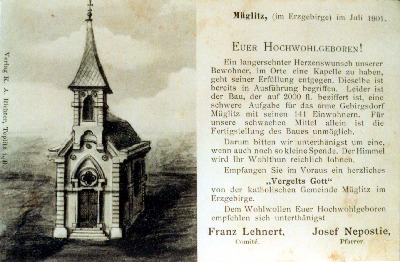 Erbittung der Finanzierung einer Kapelle in Müglitz von 1901.
