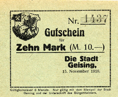 Gutschein der Stadt Geising von 1918
