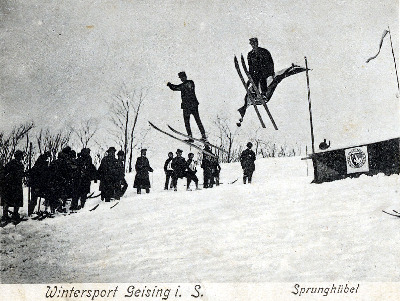 Skispringen vor 1920. Banner an der Schanze: Mit Herz und Hand fürs Alpenland